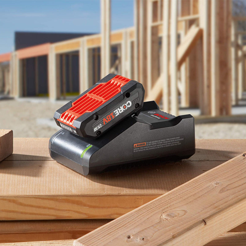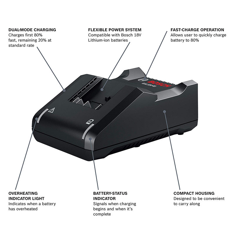 ▲Compact charger design – gets users power ready fast, with dual-mode charging, compatibility with all Bosch 18V li-ion batteries