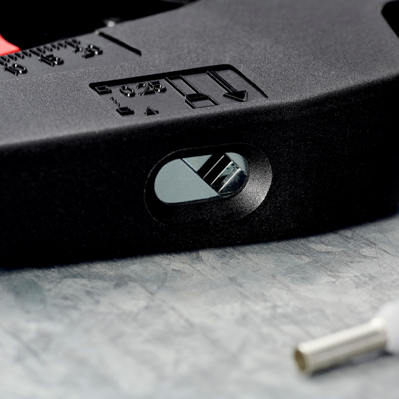 ▲Quick, precise square crimp of single wire ferrules according to DIN 46228 parts 1+4, self-adjusts for sizes 0.25 – 4 mm² / 2 x 2.5 mm² – allows for quick crimping between different sizes