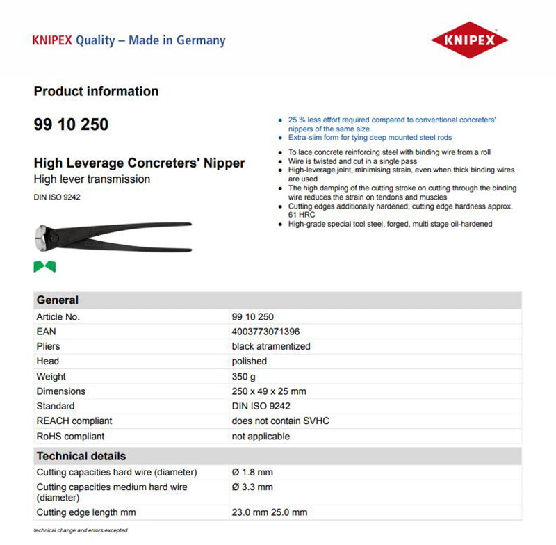 KNIPEX 99 10 250 High Leverage Concreters' Nipper High lever Transmission 250mm Labor Saving Wire Binding Plier