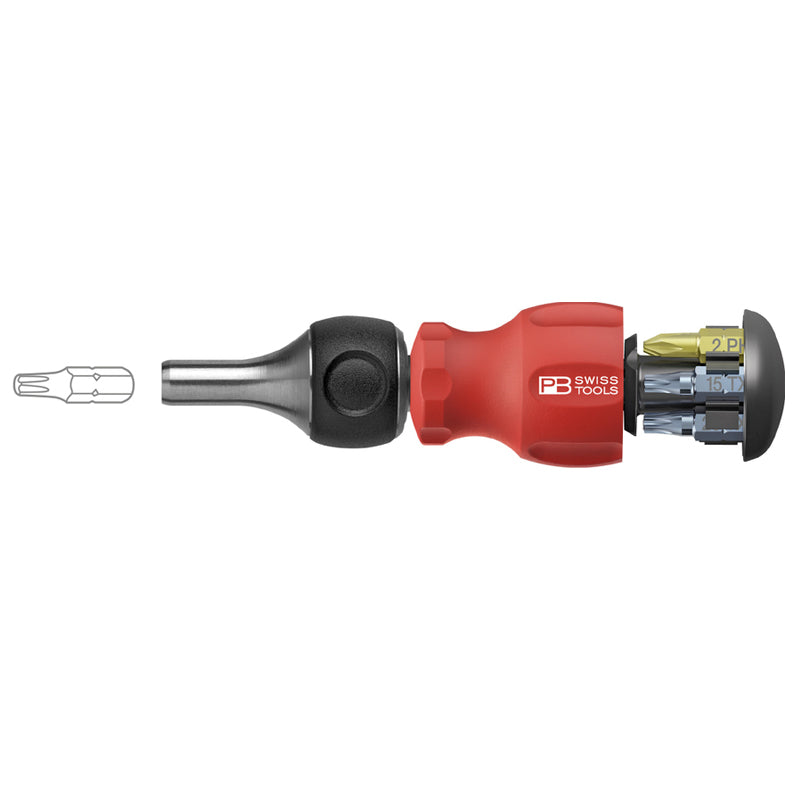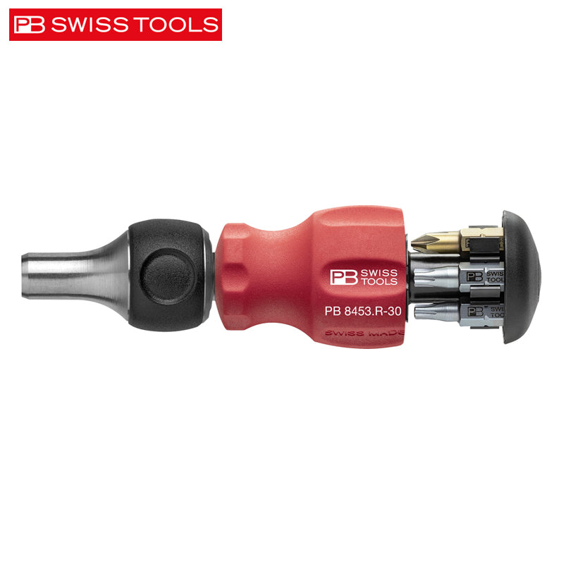 PB Swiss Tools PB 8453.R-30 Insider Stubby Ratchet - Pocket Tool with Bit Magazine and 6 PrecisionBits C6 - Swiss Made