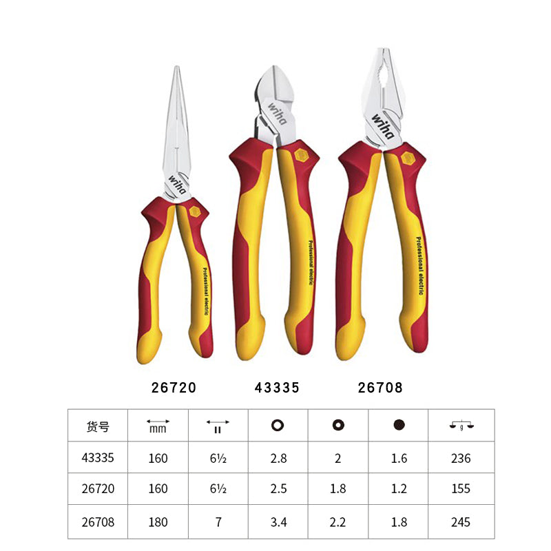 ▲The 160 mm Professional electric Wiha 26720 half-round pliers are designed for gripping, holding and cutting soft and hard materials, especially for working on parts carrying current up to 1,000 V AC.